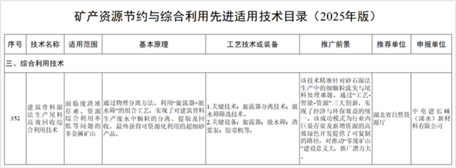 近日,自然资源部公示了《矿产资源节约与综合利用先进适用技术目录(2025年版)》,湖北长崃公司自主研发的《建筑骨料湿法生产尾料高效回收综合利用技术》成功入选,标志着公司在资源综合利用领域获得权威认可,“变废为宝”的实践路径为建筑骨料行业绿色转型提供了可复制推广的“长崃方案”。