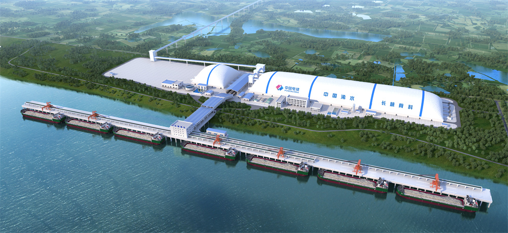 码头工程位于矿山西南方向,是项目产品外销的关键渠道,由现代化、智能化的水域码头平台和陆域堆场组成。码头陆域配套建设相应的堆场、碎石水洗系统等生产设施,占地约275亩。堆场采用气膜结构封闭,总容积为约51万m³,仓内成品骨料分五种粒径堆存,由带式输送机运至码头装船。水域使用岸线903m,结构型式为高桩梁板式,建设7个5000t级(水工结构按靠泊10000t级船设计)散货泊位,配置6台2500t/h的直线轨道式装船机,设计年通过能力达4120万t,发货效率达15万t/天。具有适应长江航运船舶规模化、大型化的发展需求,集约高效利用岸线资源、节能减排、智慧化运营等优势。